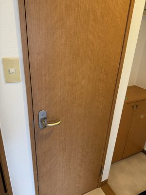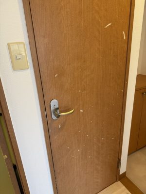 最近の建具はコストダウンのためか表面材の木目をプリントした紙を貼ったものが多く、テープを貼るとはがす際プリントがテープにくっついて木目が取れてしまいます。